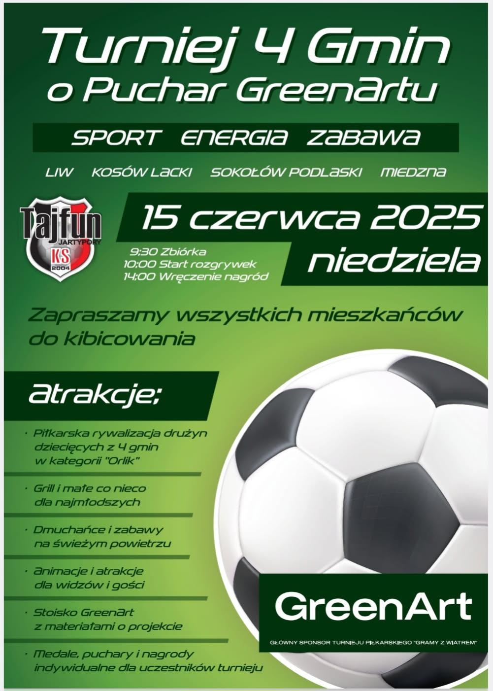 Sportowe emocje i spora dawka pozytywnej energii – tak wyglądał turniej piłki nożnej o Puchar GreenArtu, który odbył się 15 czerwca na boisku sportowym w Jartyporach. W wydarzeniu organizowanym przez klub Tajfun Jartypory wzięli udział reprezentanci czterech gmin: Liw, Kosów Lacki, Sokołów Podlaski i Miedzna. Sponsorem turnieju była firma GreenArt Development – specjalizująca się w energetyce odnawialnej. (…)